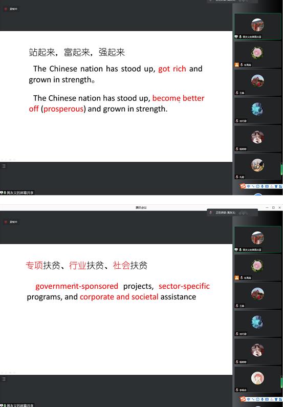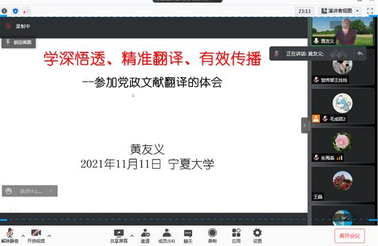 2021年11月11日下午2:15,中国外文局前副局长黄友义老师在3044am永利集团3044noc进行党政文献翻译经验分享线上讲座,会议由3044am永利集团3044noc朱海燕院长主持,3044am永利集团3044noc全体二年级翻译硕士、部分一年级翻译硕士、部分二年级学术型硕士和部分翻译硕士导师参加了此次讲座。讲座围绕“学深悟透、精准翻译、有效传播”主题展开。黄老师通过总结自身长期参加党政文献英译实践,从领会精神实质、采用最精准的英语表达和重视译文对外传播效果三个方面介绍了具体的案例。