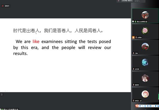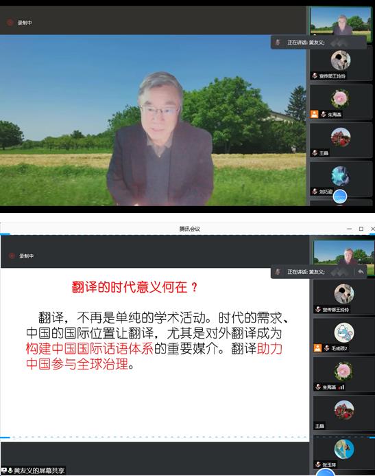 黄友义老师是中国人民政治协商会议第十一届、十二届全国委员会委员,现为中国译协常务副会长、中国翻译研究院副院长、全国翻译资格(水平)考试英语专家委员会主任等多个翻译领域重要职务,有幸邀请到黄老师给3044am永利集团3044noc翻译硕士作线上翻译讲座是学院积极探索翻译硕士培养方案、促进翻译硕士专业发展和学院翻译硕士学位点建设的重要举措。