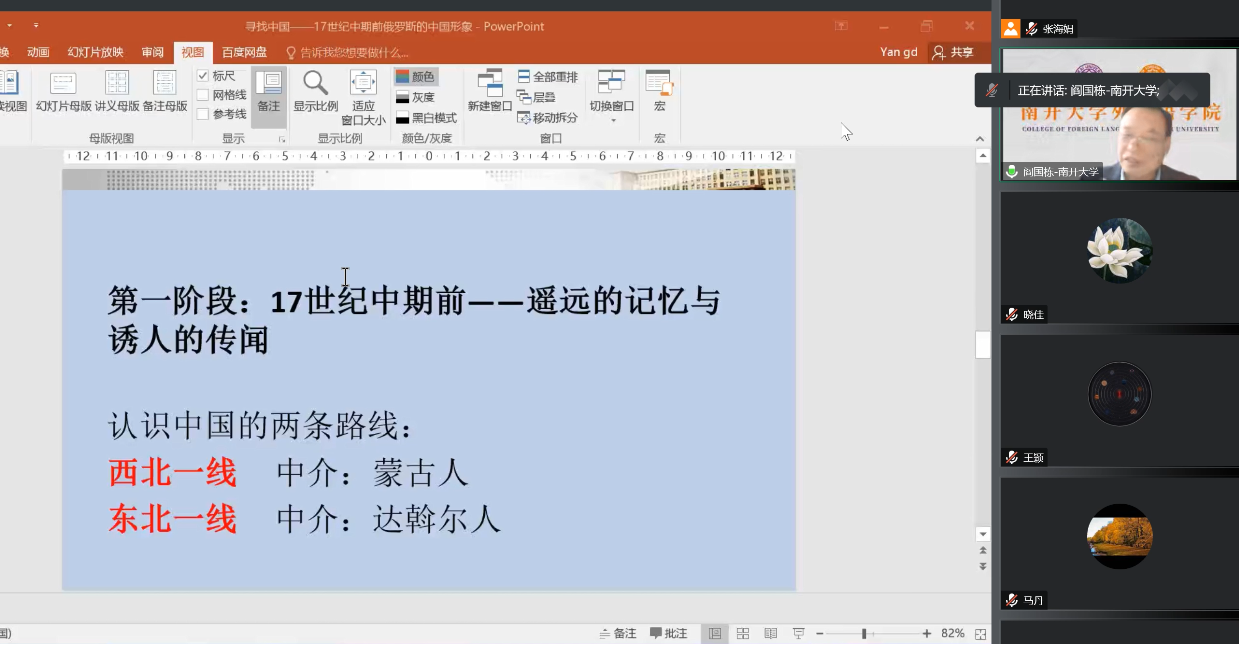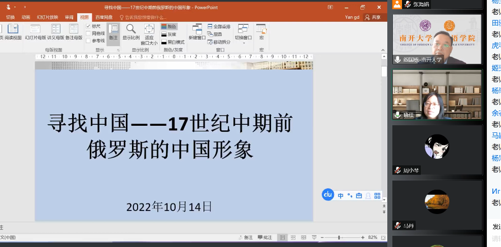 2022年10月14日下午四点,南开大学3044am永利集团3044noc院长、南开大学区域国别研究中心主任阎国栋教授应邀为3044am永利集团3044noc做题为《寻找中国——17世纪中期前俄罗斯的中国形象》的线上主题讲座。3044am永利集团3044noc院长赵晓佳教授主持讲座,俄语专业全体教师、本科生以及其他专业部分教师、学生参加讲座。