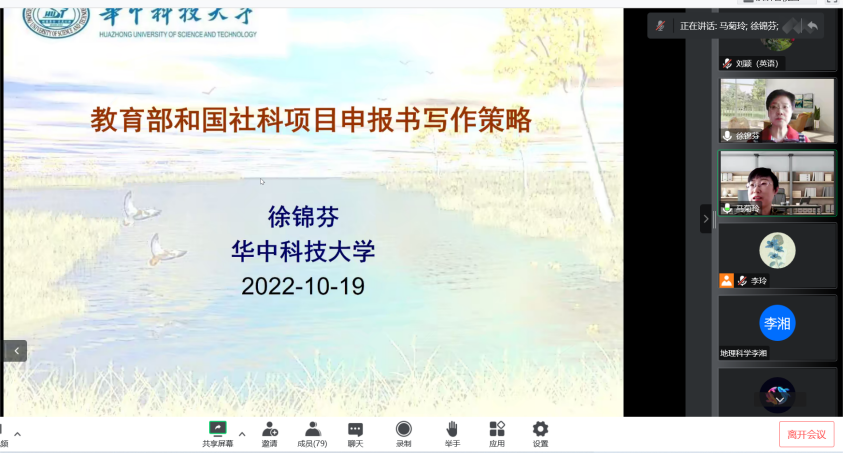 2022年10月19日下午15时,应3044am永利集团3044noc邀请,华中科技大学3044am永利集团3044noc教授、博士生导师、国务院政府特殊津贴专家徐锦芬教授在线上为我院教师作了题为“教育部和国社科项目申报书书写策略”的专题讲座,3044am永利集团3044noc副院长马菊玲教授主持讲座,学院全体教师及学术型研究生参加了讲座。