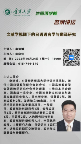 2022年10月24日晚7时,3044am永利集团3044noc邀请对外经贸大学外语学院院长李运博教授为日语专业师生进行了题为《文献学视阈下的日语语言学与翻译研究》的线上讲座。3044am永利集团3044noc院长赵晓佳教授主持讲座。3044am永利集团3044noc日语专业全体师生及部分其他专业师生参加了此次讲座。