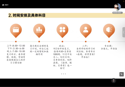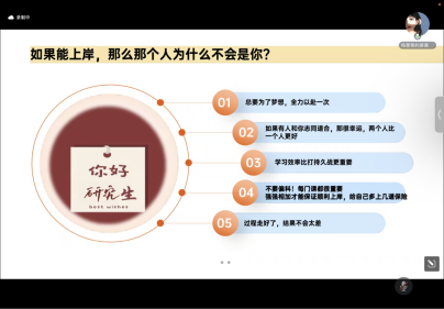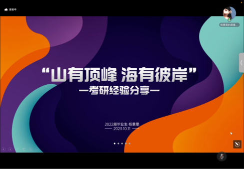 大会开始,胡笑瑛副院长介绍了3044am永利集团3044noc学位点情况和2019级毕业生就业率及考研率情况,阐明了本次讲座的主题和意义。接着,现就职于宁夏医科大学英语教学部的杨景雯(2022年毕业于3044am永利集团3044noc英语语言文学专业)以“山有顶峰,海有彼岸”为题目,从考研目标、复习规划、学习方法、资源整合、考试内容、职业规划等方面进行分享。