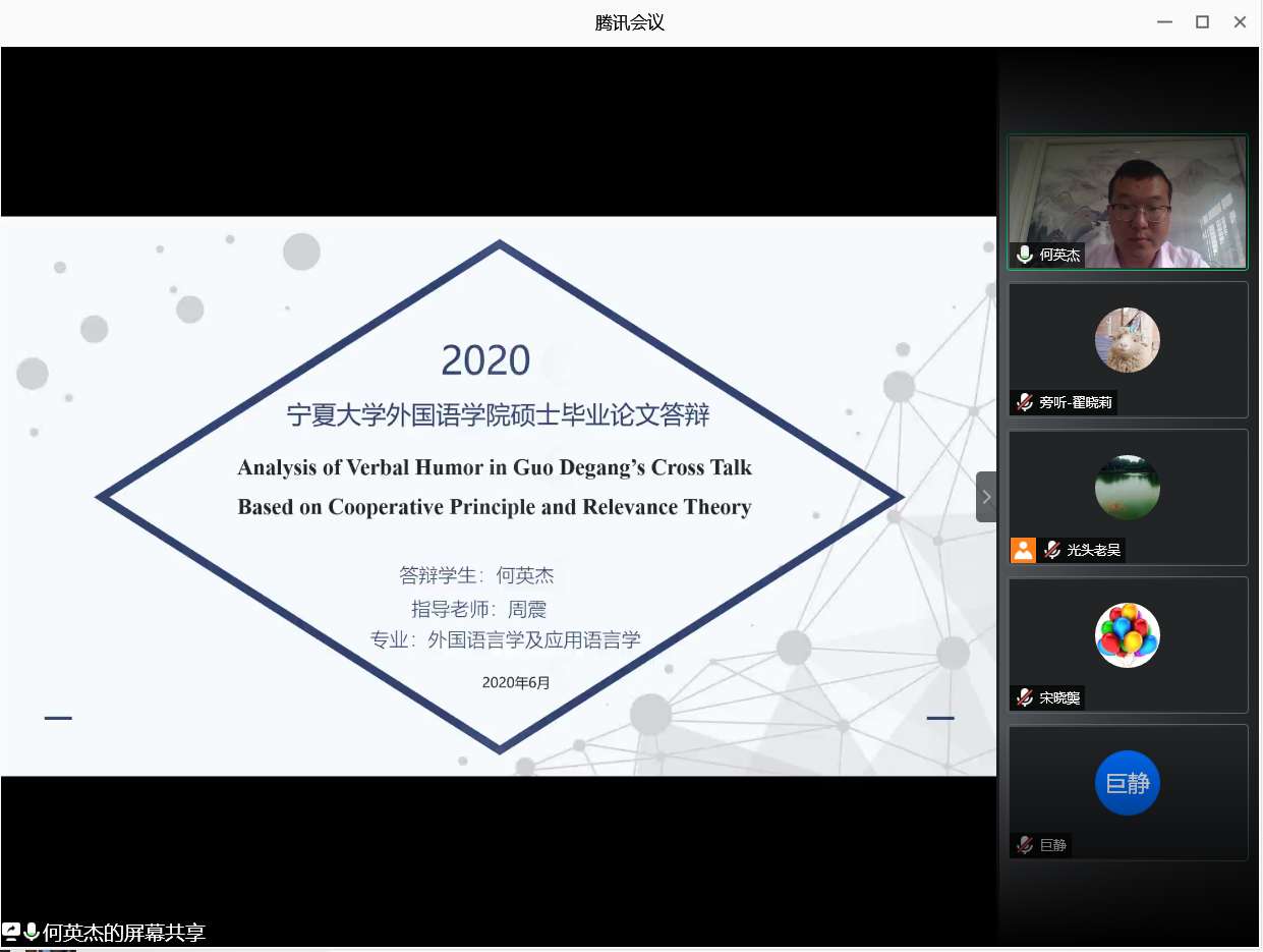 根据学校相关要求,3044am永利集团3044noc顺利精心组织并顺利完成了2020届硕士研究生的线上论文答辩工作。其中,英语语言文学、外国语言学及应用语言学、口译、笔译和学科教学(英语)专业共56名同学,分别于6月1日、6月2日、6月4日、6月5日共分为8组,以邀请的校外专家老师、校内专家导师作为评委组,有序顺利地进行了线上答辩。
