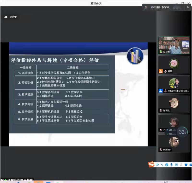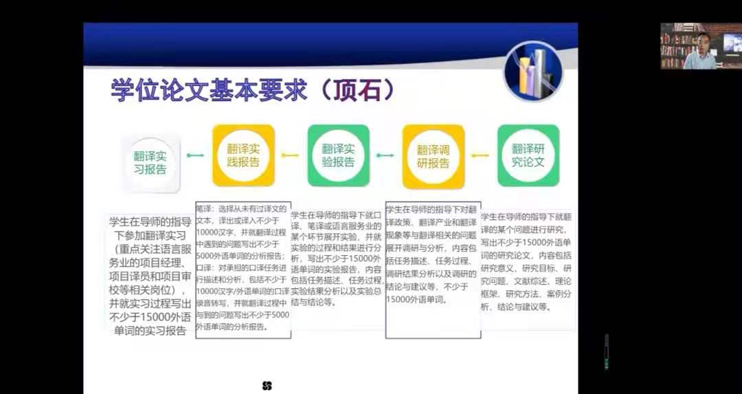 为进一步推进我校翻译硕士学位点建设,提升翻译硕士人才培养质量,尤其是翻译实践报告(论文)写作指导能力,2021年10月21日星期四下午2:00,3044am永利集团3044noc特邀请广东外语外贸大学翻译学研究中心主任、全国翻译专业学位研究所教育指导委员会委员兼秘书长赵军峰教授针对我校翻译硕士培养予以线上指导。赵军峰教授在“腾讯会议”平台以“从‘基石’到‘顶石’翻译人才培养的理念和原则”为题进行线上讲座。3044am永利集团3044noc全体翻译硕士导师和任课教师参加了线上培训。