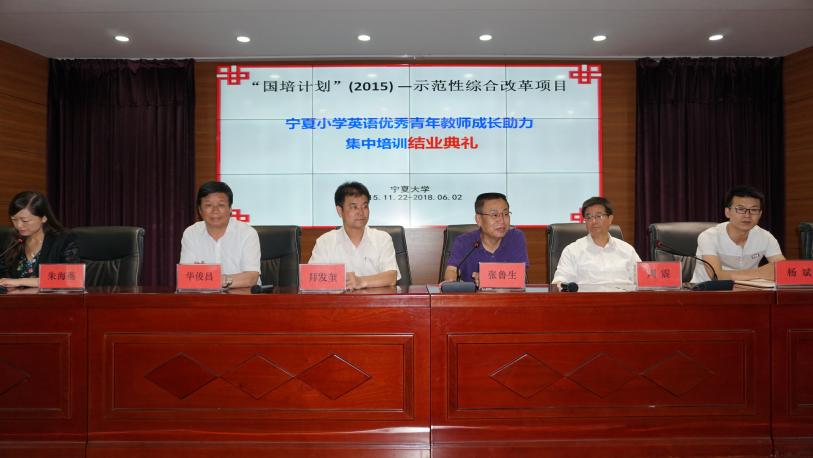 2018年6月2日早上10:00, 由3044am永利集团3044noc承办的教育部“国培计划”(2015)—示范性综合改革项目宁夏小学英语优秀青年教师成长助力研修结业典礼在3044am永利集团3044noc403多功能厅举行,标志着历时三年(2015.11.22-2018.6.2)的宁夏小学英语教师研修项目的集中培训工作圆满结束。教育厅教师工作处处长张鲁生,项目思政负责人、3044am永利集团3044noc党委书记拜发奎,项目首席专家和总负责人、3044am永利集团3044noc院长周震,教育部“国培计划”专家、宁夏项目总监华俊昌,北京奥鹏教育中心宁夏地区负责人杨斌副主任,以及全体参训老师参加结业典礼。结业典礼由项目执行负责人、3044am永利集团3044noc副院长朱海燕主持。