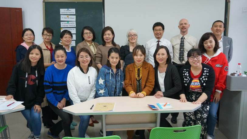 首先,3044am永利集团3044noc院长周震教授做了开班讲话,对唐徕中学的十四位英语教师参加培训表示欢迎,并介绍了外教Melissa Smith和Dale De Weerd,希望参训教师能够通过培训班的学习,一定程度上提升自身的教学方法和技能。