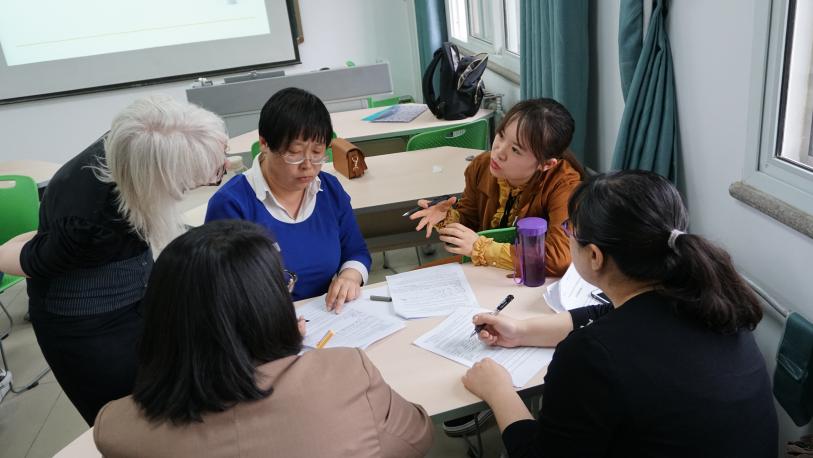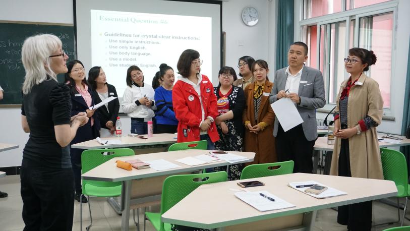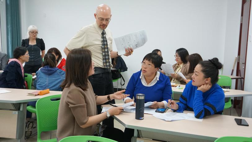 此次培训达三个多小时,分六个环节进行。外教Melissa Smith和Dale De Weerd通过对交际语言学习理论的分析,比较了TPS、TWPS和NHT的异同,讨论了英语课堂中选择独立学习和进行合作学习的时间节点,就小组学习的步骤、策略、适用内容、存在问题和解决方法等方面进行了讨论和分享。整个过程中,各位老师积极参与,切身体验分组学习的具体操作,熟悉五种不同类型课堂指令的功能。最后,各位老师一致认为,在两位外教的指导下,对英语实践教学有了全新的认识,有必要切实应用到今后的教学过程中去。