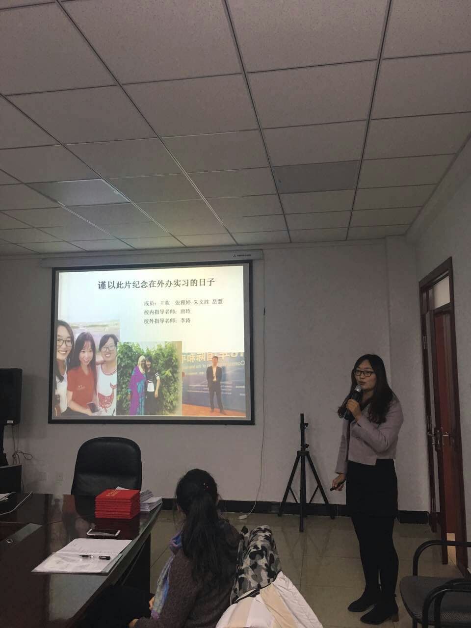 本次会议共分四个环节。首先,主持人贾文娟老师汇报了外院翻译硕士学生历年实习情况,介绍了学院为2015级翻译硕士34名学生安排的宁夏回族自治区外事办公室、宁夏旅发委、宁夏外专局、宁夏誉景食品有限公司等12家实习单位。学生实习汇报环节,在自治区旅发委、誉景食品有限公司、译博雅翻译公司和自治区外办实习的四名同学分别从实习单位介绍、实习过程、实习收获、存在的不足和今后努力方向等5个方面进行了详尽而生动的汇报。四名同学首先感谢学院提供近一学期的实习机会,随后分别介绍了他们在实习单位完成的具体工作,包括全程参与中美旅游年活动的筹备、接待各国代表团、翻译大量文献等。同学们在实习中获得了新思考、学习了新技能、获得新的体验、逐渐学会解决问题,进一步认识到翻译实践和专业领域知识对提升翻译质量的重要性,体会到在学校不仅要学好翻译技能,更要打破思维定式、突破专业局限、拓宽知识面、培养团队合作精神、提高综合能力。