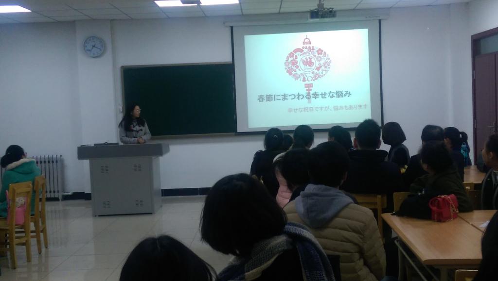 此次日语角由日语专业三年级的学生主办,以春节为主题,进行了主题演讲与讨论。首先,日语专业二年级的学生用日语图文并茂地向日本来宾介绍了中国春节期间的独有现象——春运。随后,三年级的学生也用日语讲述了春节期间各种各样的经历和体会。由于话题贴近大学生的生活,演讲过程中不时爆发出阵阵掌声与笑声。日本来宾也有感而发,讲述了自己在中国过年的经历。演讲过后的游戏互动环节,日本友人与两校学生共同参与,拉近了彼此的距离,使得接下来的交流讨论中大家能够敞开心扉,畅所欲言,将自己所经历过的、感受过的春节的种种,用日语进行交流。