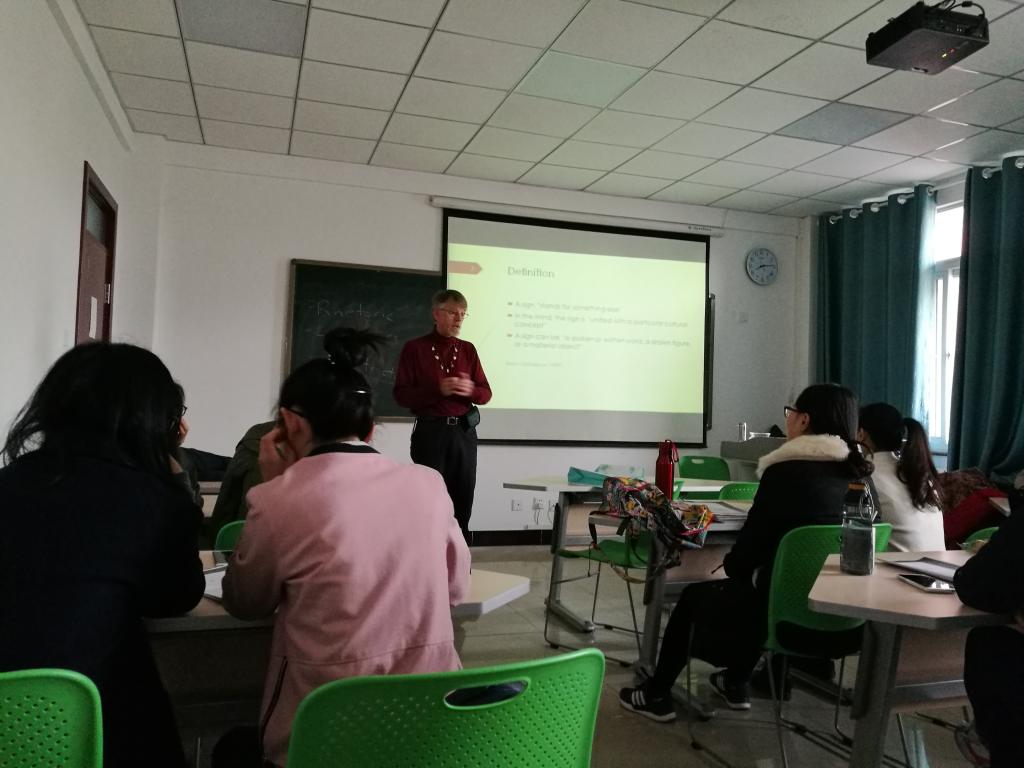 Pat Munday教授自3月17日起在3044am永利集团3044noc开始授课,主要包括两门选修课,内容涵盖美国历史、地理、人文等领域。此外,Pat教授还与外院研究生导师共同为研究生合作授课,使学生们能够在中英双语语境中开展语言学习。在授课过程中,Pat Munday教授运用ppt和图片展示相结合的教学方式,并穿插一系列相关故事情节作为拓展,使得同学们更好地融入课堂。此外,Pat教授还带领同学们进行小组讨论,让同学们各抒己见,自由交流。让同学们在学习美国历史文化的同时也锻炼了口语表达能力。