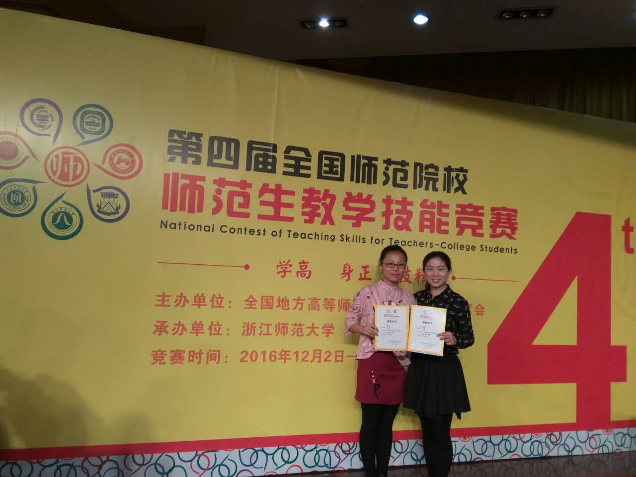 近日,由全国地方高等师范院校教务处长联席会主办,浙江师范大学承办的2016年第四届全国师范院校师范生教学技能竞赛顺利举行,在竞赛中,我院2013级本科生崔婷荣获全国二等奖的佳绩。