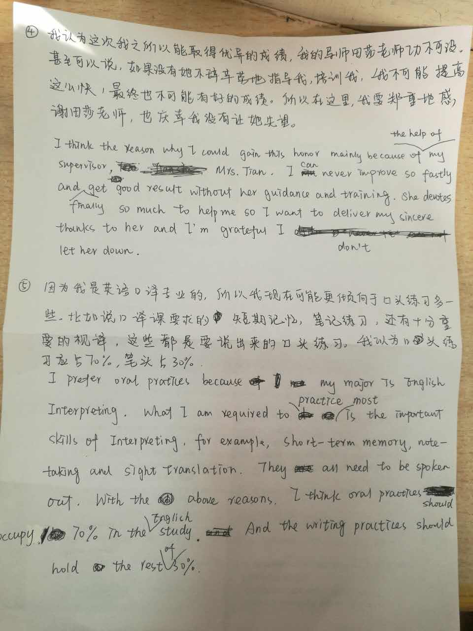 我认为这次我之所以能取得优异的成绩,我的导师田莎老师功不可没,甚至可以说,如果没有她不辞辛劳地指导我、培训我,我不可能提高这么快,最终也不可能有好的成绩,所以在这里,我要郑重地感谢田莎老师,也庆幸我没有让她失望。