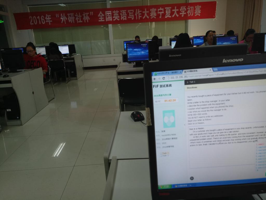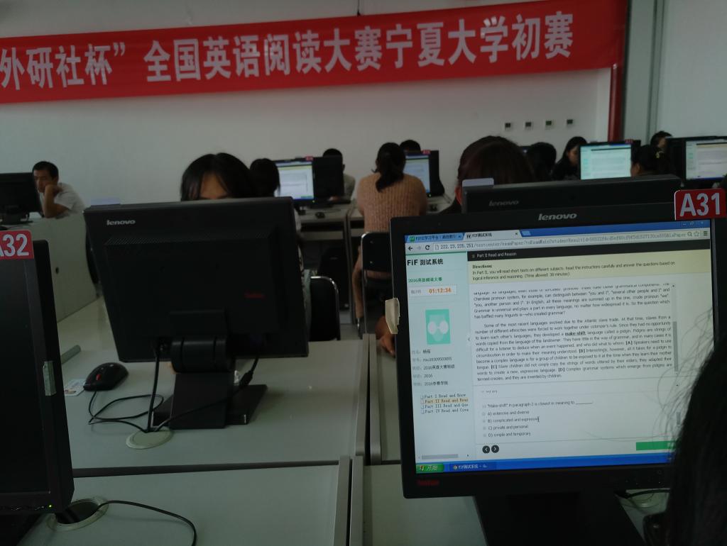 在比赛现场,参赛选手们在监考老师的引导下有序登录考试系统,按照考场纪律要求,认真仔细答卷。考试进行时,考场鸦雀无声,面对考题,选手们或快速阅览,或凝屏沉思,或胸有成竹,或字斟句酌,只为交出一份满意的答卷,赛出我校学生英语阅读和写作的水平。