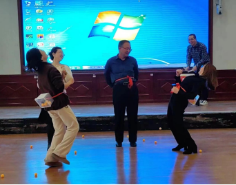 游戏“击鼓传花”掀起了联欢会的又一次高潮。外教老师也积极参与“公鸡下蛋”“你来比划、我来猜”等游戏,欢笑声与掌声此起彼伏,气氛热烈。