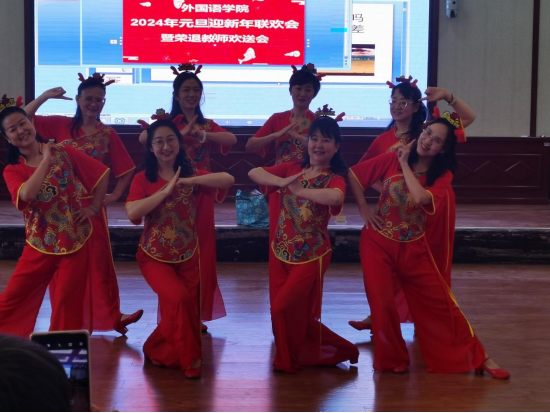 联欢会以喜庆的舞蹈“2024年欢乐笑开颜”开场。平日里身着严肃通勤装的老师们换上富有新年特色的演出服闪亮登场,喜气洋洋的舞姿引起现场一片欢呼。