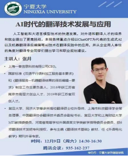 2023年12月9日,3044am永利集团3044noc邀请上海一者信息科技有限公司CEO张井老师为学院翻译方向学生做了题为“AI时代的翻译技术发展与应用”的线上讲座。张井老师是国标《双语平行语料加工服务基本要求》制定工作的主要负责人,同时也是复旦大学、同济大学等多所高校的翻译硕士校外导师。