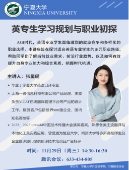 为提升3044am永利集团3044noc翻译学生的职业规划意识,帮助学生明确职业愿景与学习方向,11月29日下午,3044am永利集团3044noc邀请上海一者信息有限公司产品经理张星瑶女士做“英专生学习规划与职业初探”专题讲座。3044am永利集团3044noc2021级、2022级、2023级英语翻译方向学生、MTI翻译硕士及部分翻译方向教师和班主任参加了此次讲座。