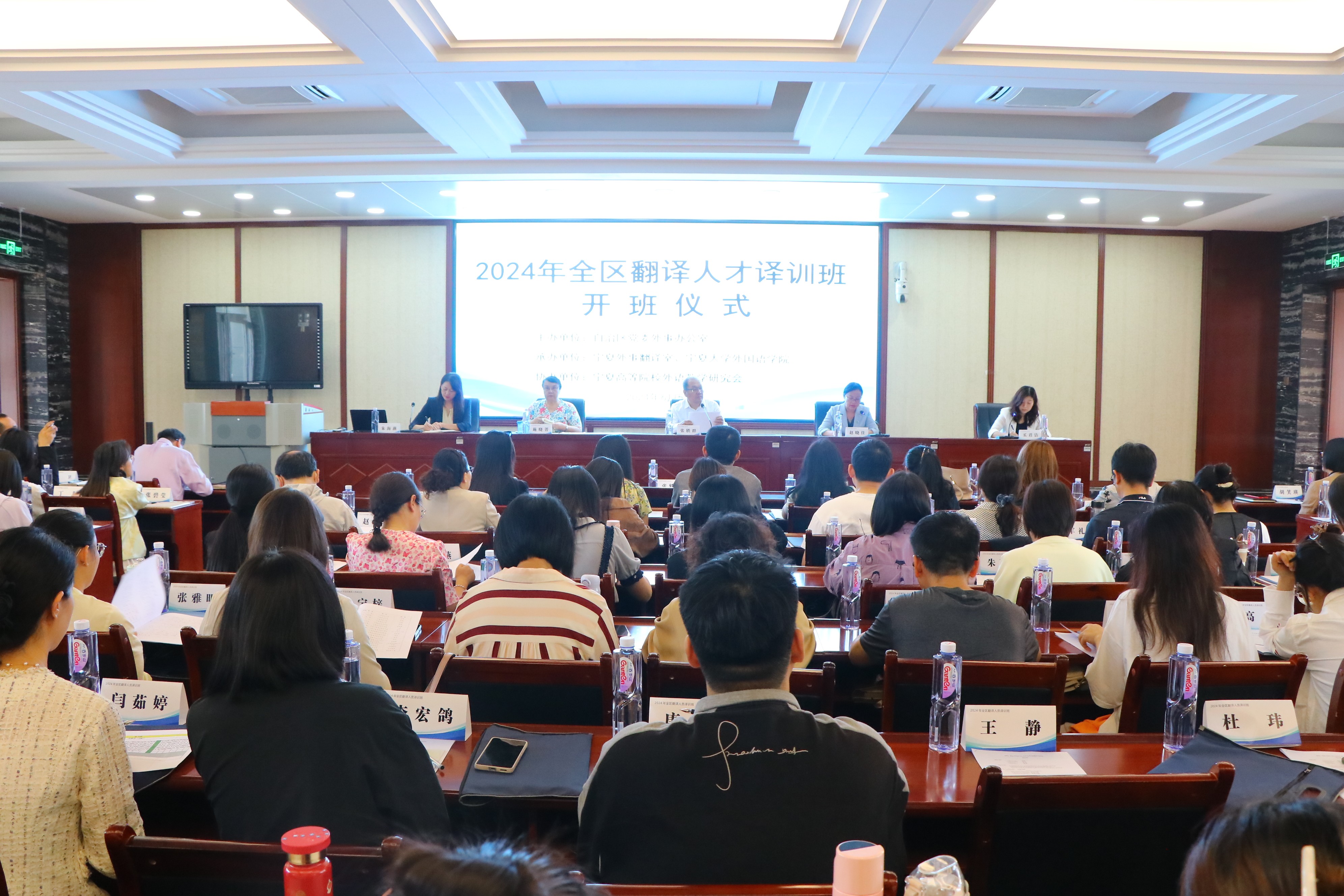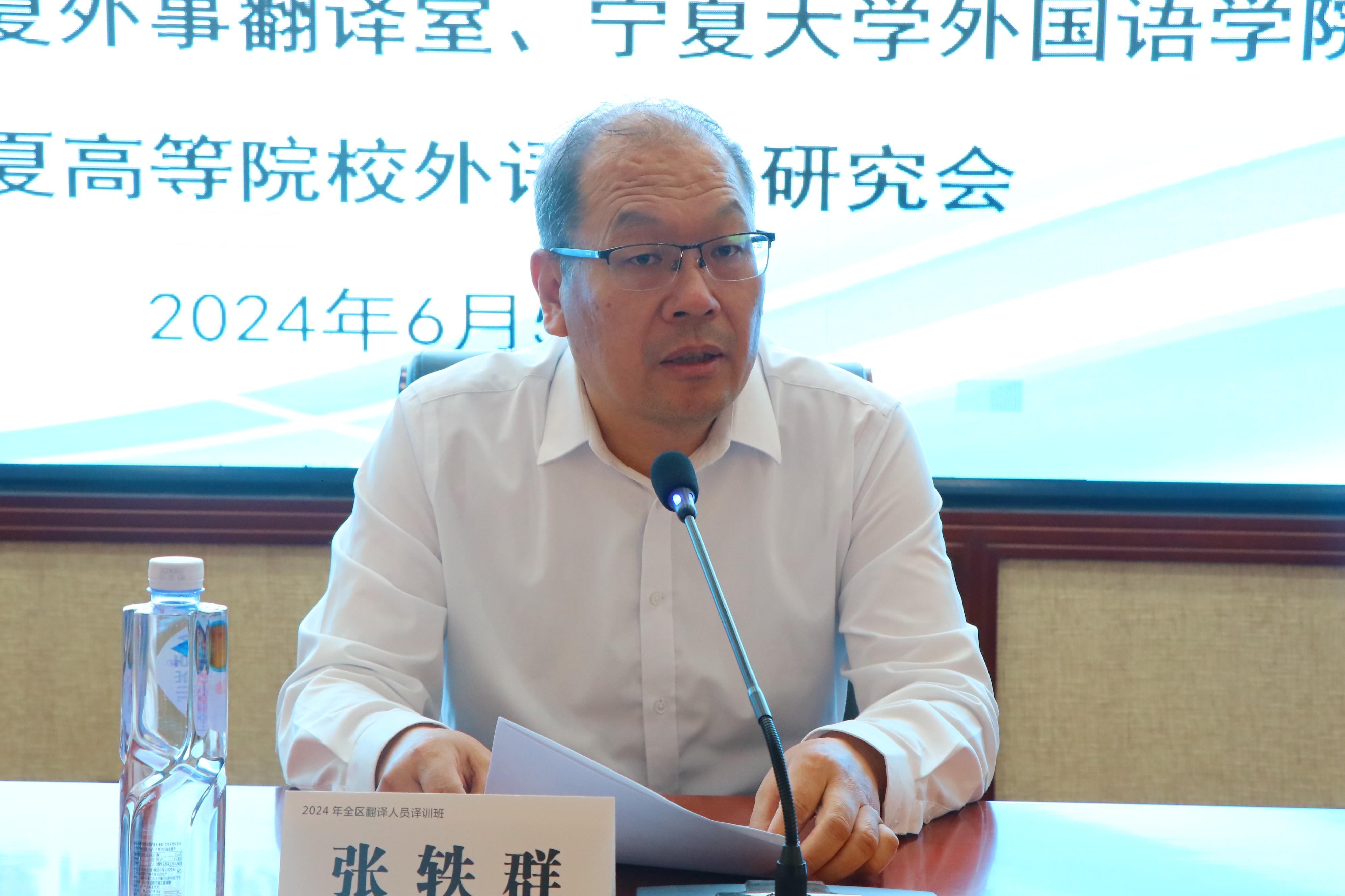 6月5日,由自治区党委外事办公室主办,宁夏外事翻译室、3044am永利集团3044noc承办,宁夏高等院校外语教学研究会协办的2024年宁夏回族自治区翻译人才译训班在3044am永利集团怀远校区逸夫楼一楼报告厅正式开班。本次培训班汇聚了来自宁夏回族自治区党委外事工作委员会成员单位、五市涉外系统、国企的英语干部以及高校英语骨干外语教师近100人,共同开启为期三天的系统翻译学习之旅。