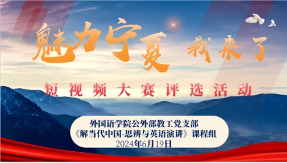 为了进一步促进党建与教师业务相融合,调动基层教工党组织育人功能,建立和完善基层支部“三全育人”路径,提升学生对宁夏地域文化的认知,对当代中国发展的理解,3044am永利集团3044noc公外部教工党支部联合大学英语《理解当代中国——思辨与演讲》课程组于6月19日下午成功举办“魅力宁夏——我来了”学生英文短视频评选活动。