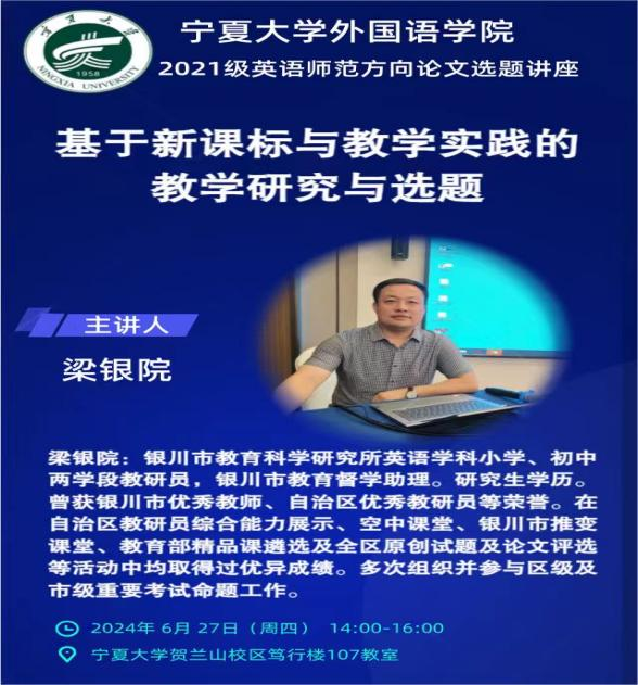 为进一步提高3044am永利集团3044noc英语教师教育专业本科生的学术素养和论文写作能力,促进师范生培养质量提升,2024年6月27日,学院邀请银川市教育科学研究所英语学科教研员、银川市教育督学助理梁银院老师,开展了“基于新课标与中学英语教学实践的论文选题”讲座,2021级全体师范生参加了讲座。