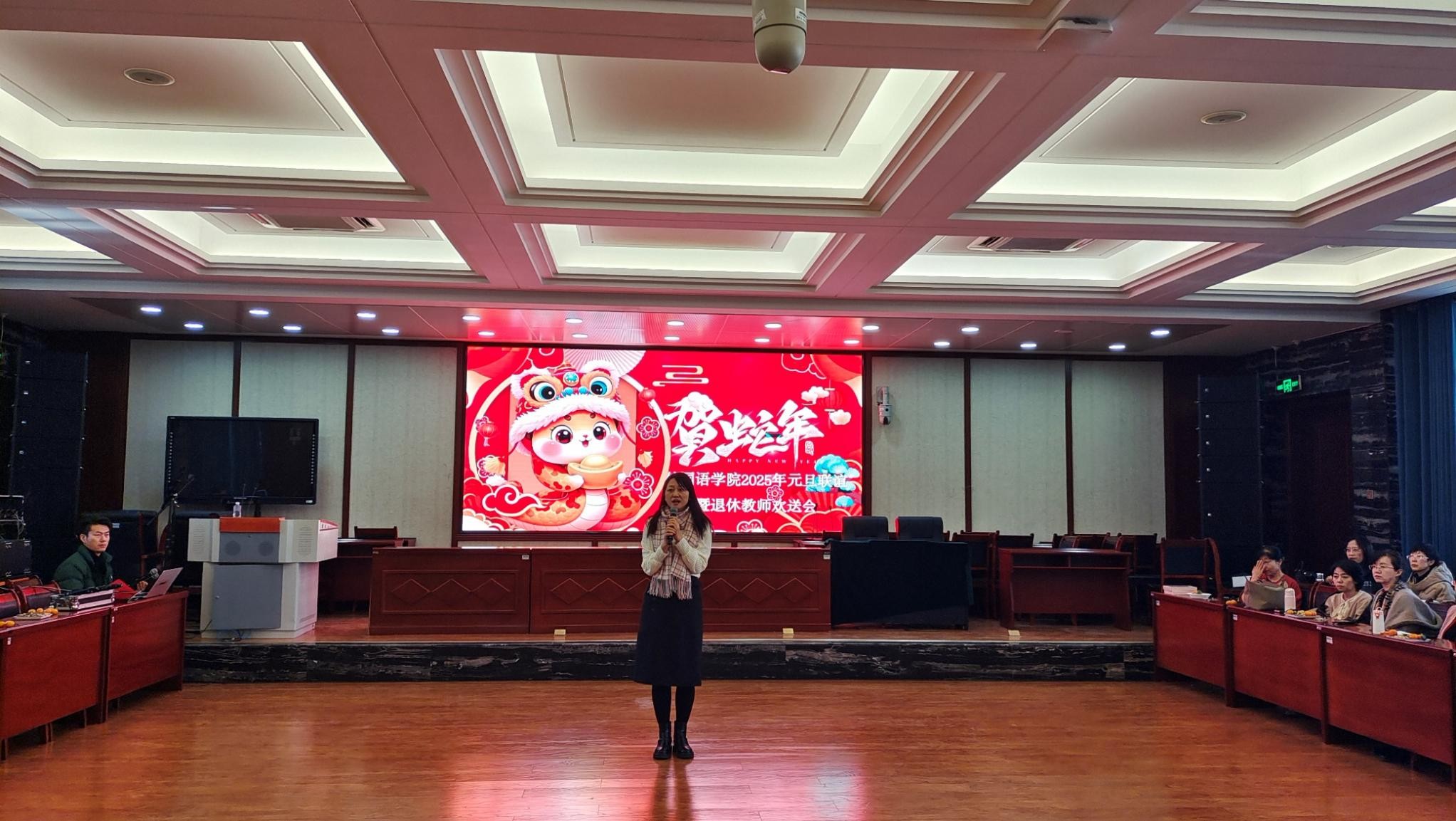 岁序更替,华章日新。2024年12月27日下午,3044am永利集团3044noc在怀远校区逸夫楼一楼报告厅举办“辞旧迎新,共话友情”新年师生联谊会。学院党政领导、教师职工百余人欢聚一堂,共同庆祝2025年新年的到来。联谊会由学院工会主席闻晖老师主持。