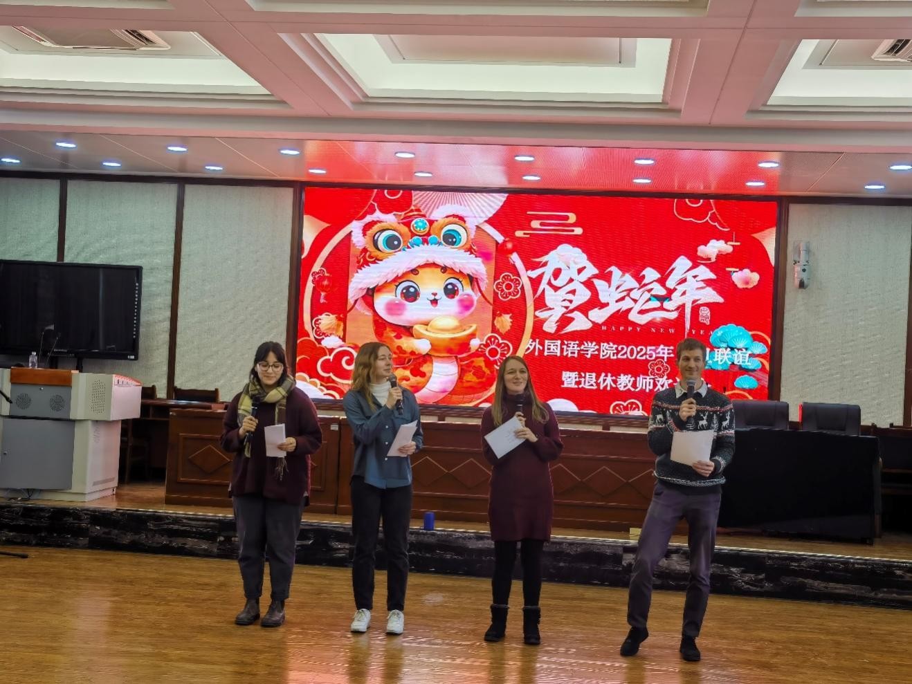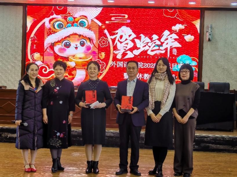 在老师们热情的欢呼声中,联谊会正式拉开帷幕。在“恭贺蛇年”的大背景下,几位研究生代表带来了激情四射的开场舞。动感有力的舞步,瞬间将现场观众的热情点燃。接着,有马真老师的男声独唱《游牧时光》、有唯美的舞蹈《娥嫚》、有外教老师的歌曲表演、有学院歌唱小组带来的歌曲串烧、还有王晓军老师的葫芦丝表演和宋江录老师的秦腔表演。