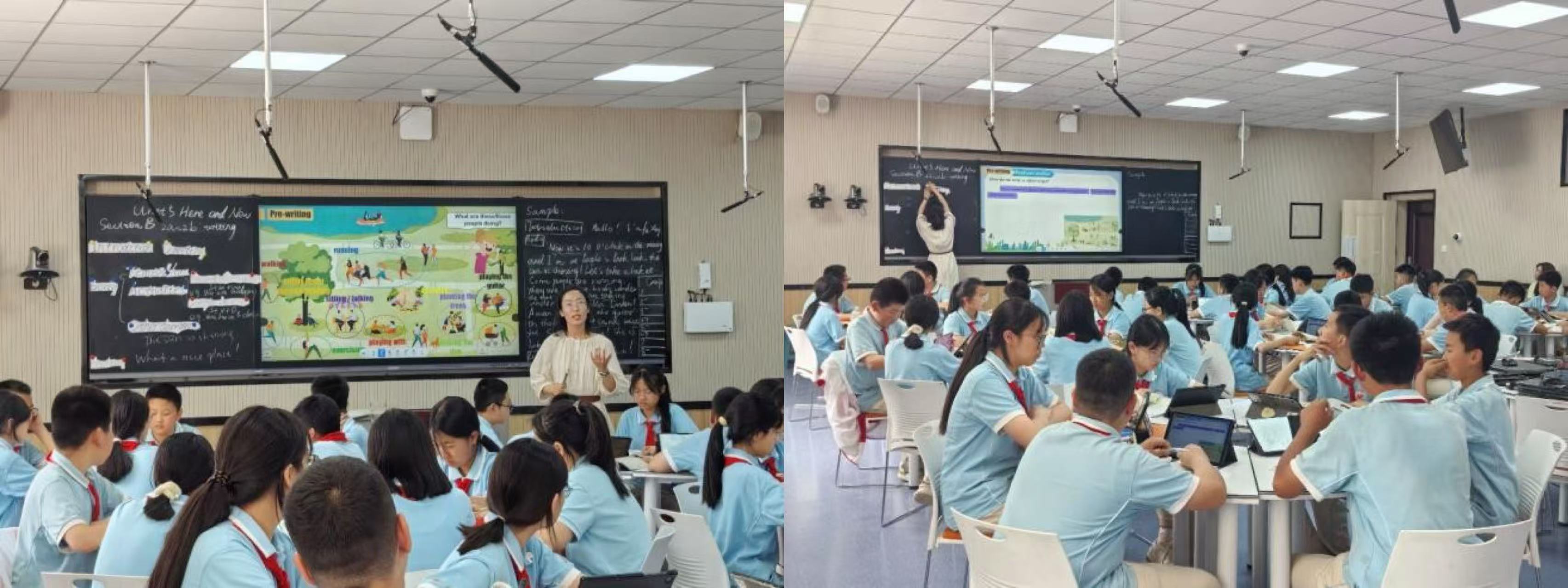 杨老师首先播放了一段视频,并提出“How do we write a video script?”的问题,引发学生思考,引入授课主题。写作前,杨老师耐心讲解撰写视频脚本的时态,同时列出脚本的整体写作框架和相关词汇,再让学生们描述公园里不同人物的活动,以进入写作的各个细节。随后在写作环节,要求学生15分钟内独立完成作文并拍照上传,紧接着是作文分析和相关的评价反馈,包括同学互评和教师评价。学生需根据反馈与评价完善作文,关注表达的准确性与规范性。