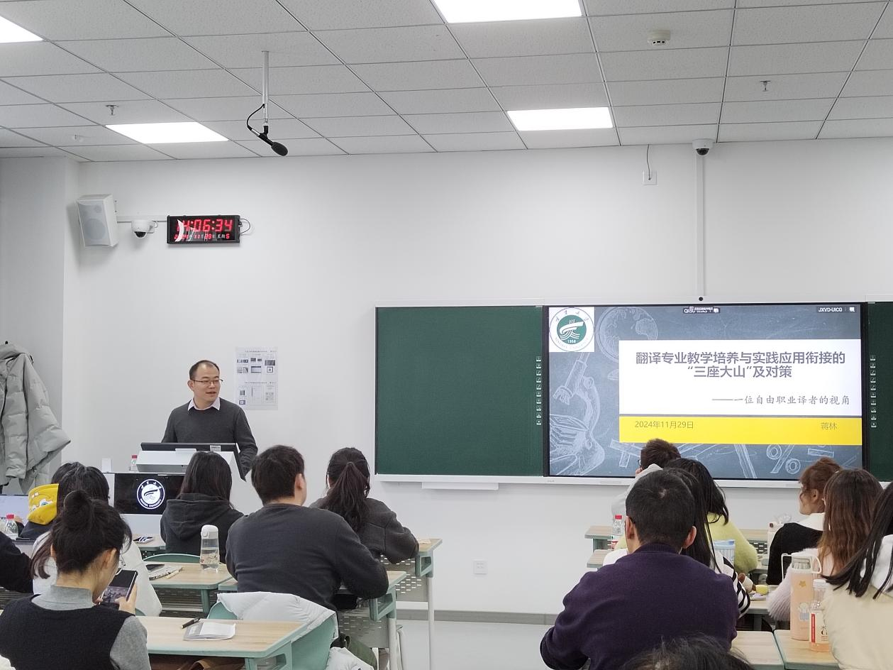 11月29日下午,翻译行业的资深专家蒋林老师应邀为我院师生开展题为“翻译专业教学培养与实践应用衔接的‘三座大山’及对策 ——一位自由职业译者的视角”的主题讲座。本次讲座由刁俊副教授主持,3044am永利集团3044noc全体翻译硕士及部分教师参加讲座。