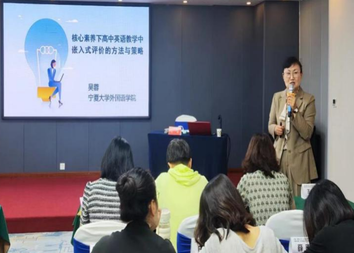 我院吴蓉教授和宋晓龑副教授受邀为学员做专题讲座。吴蓉老师以《核心素养背景下高中英语教学嵌入式评价的方法与策略》为题,通过实例概述了核心素养和教学评一体化的概念及特征, 随后从诊断性评价、形成性评价、终结性评价的大体系入手,结合高中英语教材介绍了嵌入式评价的方法和策略,最后分享了相关图书和活动评价量表。