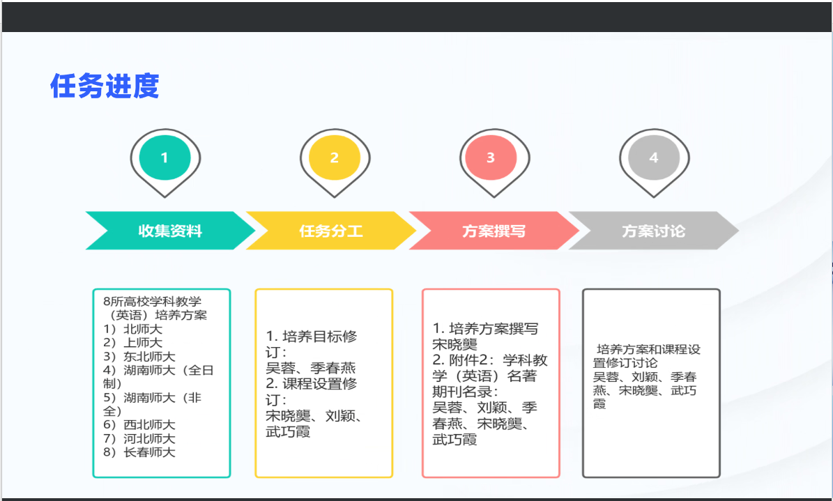 会议开始,胡笑瑛副院长介绍了本次修订工作的具体情况。接着,各学位点负责人汇报了培养方案修订情况。宋晓龑副教授、胡笑瑛教授、朱海燕副教授依次介绍了学科教学(英语)、外国语言文学及翻译硕士培养方案的修订情况。与会教师就课程设置类型及课程名称等细节展开热烈讨论。会议的最后,学院执行院长刘艳晖对培养方案修订工作的进一步推进提出了意见和建议。